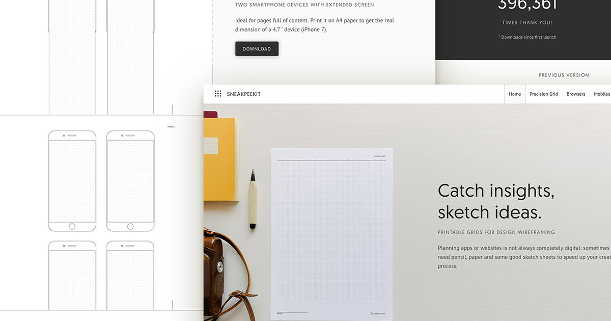Quickly design awesome website wireframes and mockups on our Sneakpeekit Browser©. We provide a large sketch sheets collection with many different canvasses, grids and PSD grid templates. Any sketch sheet is a ready-to-print A4 PDF template. We have included PSD Photoshop grid templates too for quickly converting your sketch in a graphic mockup.